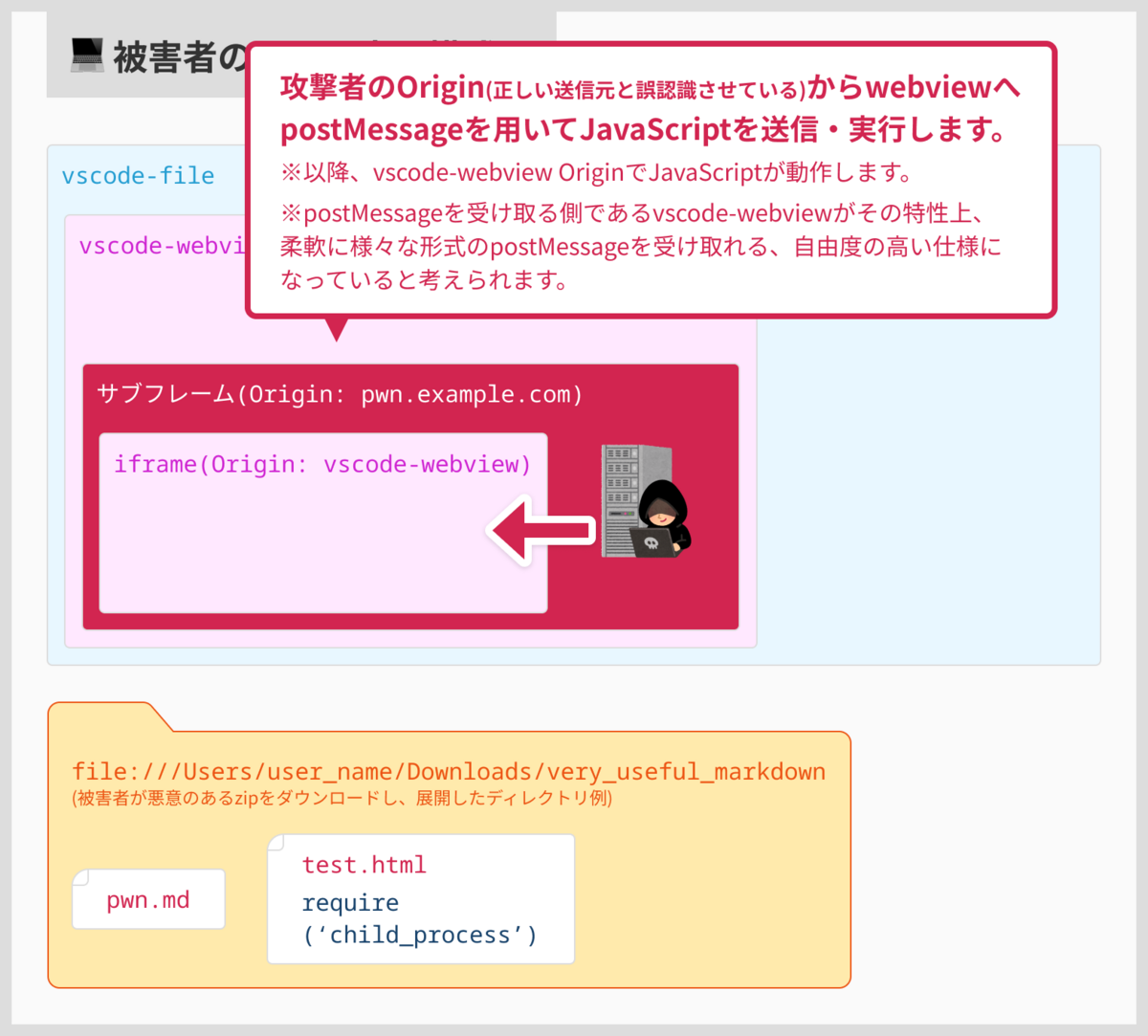 この結果、vscode-webview://内のサブフレームのOriginはhttp://攻撃者ドメインの状態で処理は進みます。