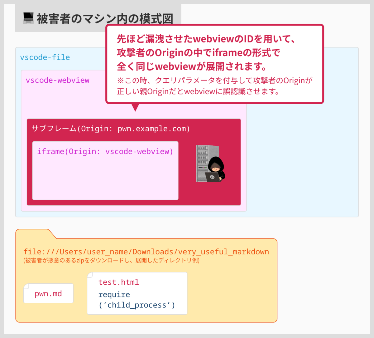 vscode-webview://が保持するIDを用いて、手順2と同一のwebviewをiframeにて展開 - 攻撃者のOriginから