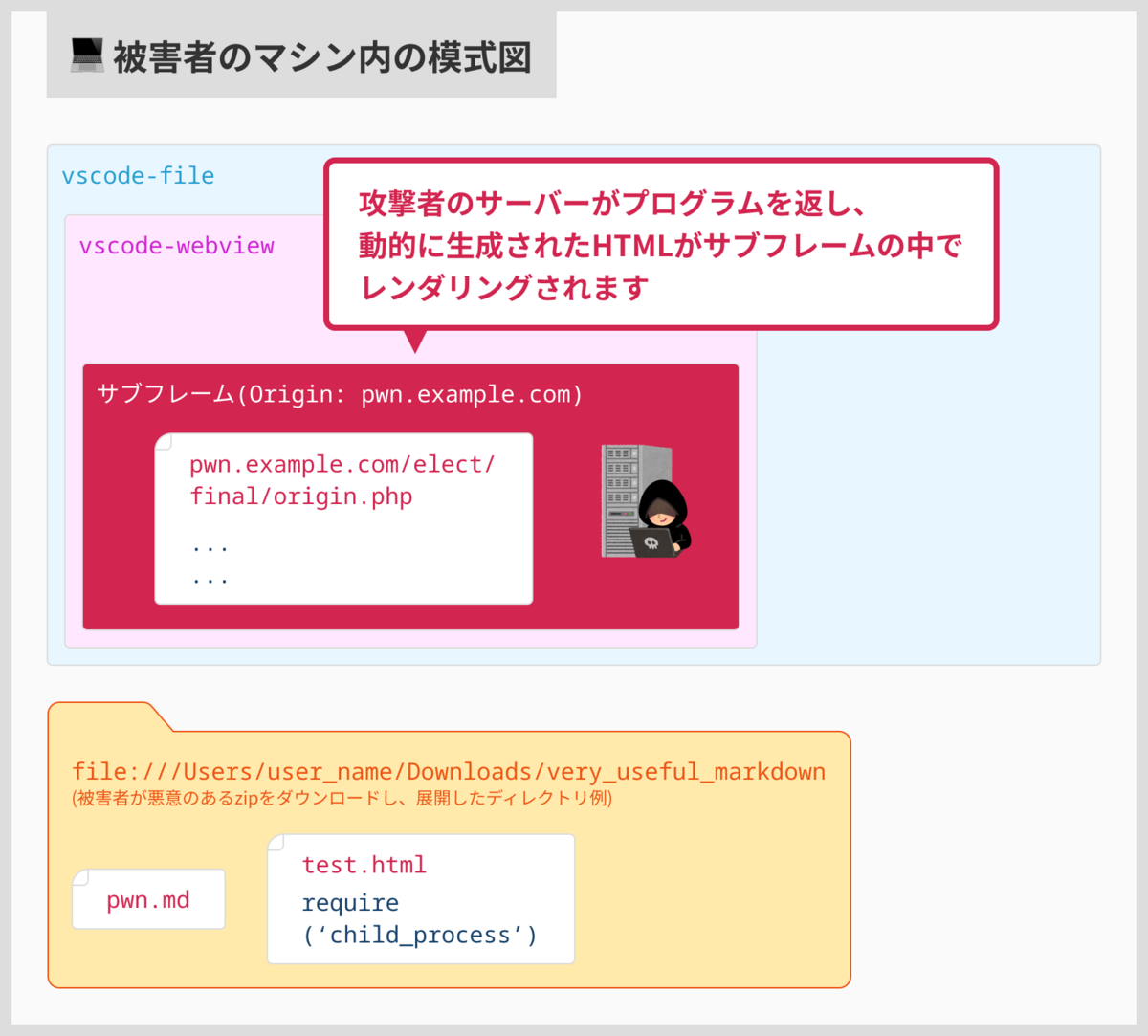 - 悪意のあるMarkdownファイルがユーザーのVS Code上で開かれる(pwn.md)